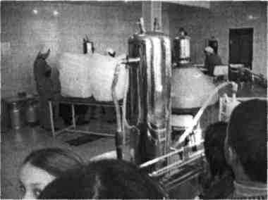 С процессом производства нас познакомила технолог этого предприятия Киселева Наталья Валерьевна. Знакомство мы начали с карусельной печи, в которой специальная заготовка, называемая пресс-формой, подогревается, а затем из нее выдувается бутылка нужной формы. Машина запрограммирована таким образом, что из пресс-формы разного веса получаются бутылки разного объема (например, из пресс-формы весом 27 граммов выдувается пол-литровая бутылка, а из пресс-формы весом 42 грамма в течение 2 секунд выдувается полуторолитровая. А чтобы получить пятилитровую тару, необходима пресс-форма весом 96 граммов).Далее нас провели в отдельное помещение, где готовят настои и композиции душистых веществ. При их приготовлении используют ароматические эссенции, чагу, брусничник, березовые листья, взвешивают все по граммам, а затем