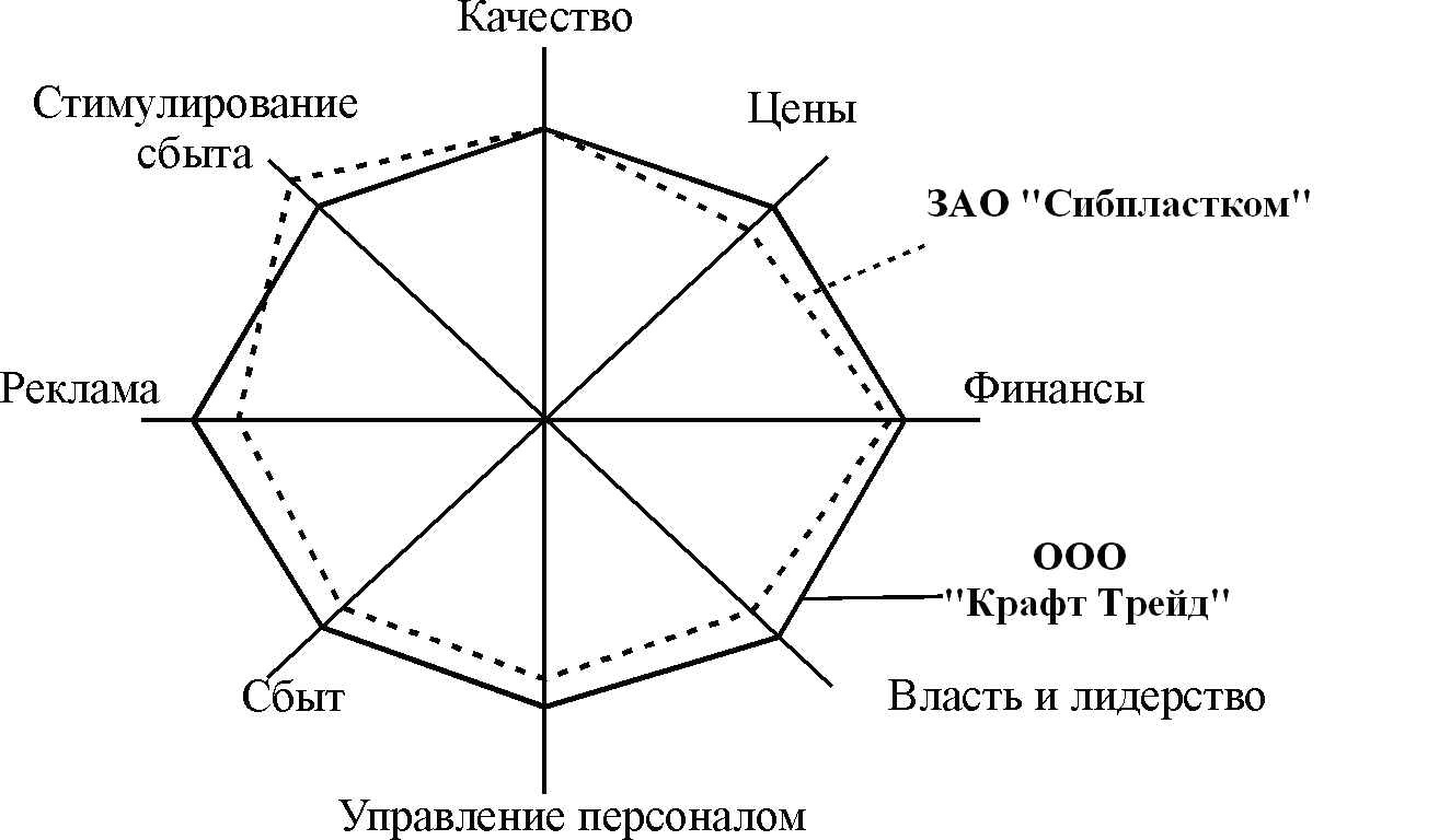 В работе проведен анализ конкурентоспособности ООО «Крафт трейд» и ЗАО «Сибпластком» (г. Новосибирск). Результаты анализа представлены в виде многоугольника конкурентоспособности (рис. 5).