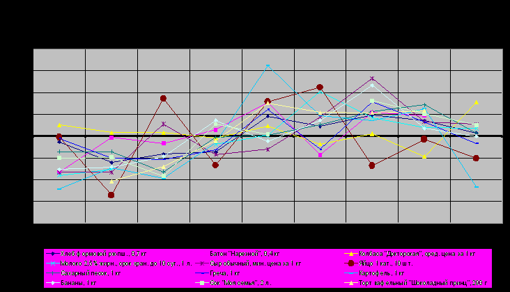 Результаты наблюдения, представленные на Графике 1, показывают, что в настоящее время крупные торговые сети уже заняли «низкую» ценовую нишу, потеснив МРТ и средние магазины, не способные конкурировать с ними по ценам. Даже в «ларьках» на «Варшавском рынке», который на протяжении многих лет у населения этой части Московского района пользовался славой самого дешевого места покупок, цены на ряд товаров выше, чем в расположенном рядом универсаме сети «Пятерочка».