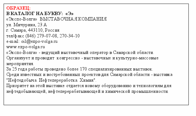 При подготовке информации о Вашей фирме соблюдайте последовательность расположения контактных данных, строго по образцу ОБРАЗЕЦ ИНФОРМАЦИИ на русском языке, 900 печатных знаков (бесплатно для экспонентов), не включая пробелы и знаки препинания: