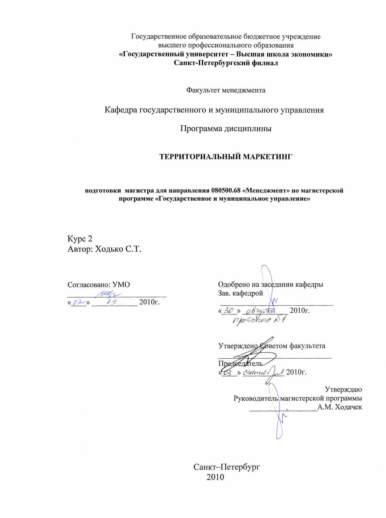 Дисциплина по выбору «Территориальный маркетинг» предназначена для магистрантов, обучающихся по магистерской программе «Государственное и муниципальное управление» факультета менеджмента СПб филиала ГУ-ВШЭ и изучается на втором году обучения в 1 и 2 модулях.