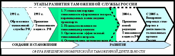 Ретроспективный анализ динамики развития таможенной службы России, начиная с момента ее реформирования в 1991 г., позволил сделать следующие выводы. После распада СССР таможенная служба России прошла несколько этапов становления и развития (рис. 2).