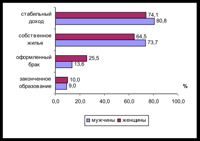 5. Семейные ценности 1. Семейное положение. Среди людей-XXI в официальном браке состоят больше половины (54%), еще 10% состоят в гражданском браке. Третья часть (36%) в браке не состоят, и львиную долю этой трети составляет еще не определившаяся молодежь до 30 лет. Очевидно, что брачность среди людей-XXI гораздо выше, чем среди всего населения. 2. Наличие семейных традиций. Большинство людей-XXI (55%) считают, что в их семьях традиции есть, и порядка 40% наличие традиций отрицают. Анализ распределений по разным социально-демографическим характеристикам показал, что бóльшая неопределенность статуса связана с меньшей готовности признавать традиции в собственной семье. Готовность признавать традиции в семье сильнее всего связана с семейным положением: супруги, официально зарегистрированные в браке, проявили максимум готовности, далее идут не состоящие в браке, и наименее традиционными предстали пары, живущие в незарегистрированном браке. По-видимому, свежесть чувств, которую придает незарегистрированный брак, достигается именно незавершенностью «семейного проекта», которая и препятствует его объективной и субъективной традиционализации. Сравнение с данными по населению в целом показывают, что продвинутые потребители более активны в своем брачном поведении. 3. Условия обзаведения первым ребенком. Если суммировать мнения о том, когда женщине и мужчине лучше обзаводиться первым ребенком, то окажется, то для женщины оптимальный период – это 20–28 лет (85% мнений), а для мужчины – 23–31 год (80% мнений). ![]() Рис. 2. Оптимальный возраст обзаводиться первым ребенком Значимых различий по этому вопросу ни по одному из других социально-демографических характеристик нами не замечено. Помимо возрастных оптимумов обзаведение первым ребенком требует и иных условий. Основных условия – два: стабильный доход и собственное жилье. ![]() Рис. 3. Условия для обзаведения первым ребенком Как видим, официальный брак сравнительно немногие считают необходимым условием, чтобы обзаводиться первым ребенком. Очевидно, что штамп в паспорте не для многих россиян играет роль гаранта, а забота о законнорожденности ребенка далеко отступает на задний план, оттесняясь прагматическими соображениями. 4. Отношение к официальному и гражданскому браку. Относительно необходимости официально регистрировать брак совместно проживающим мужчине и женщине мнение продвинутых потребителей разделилось примерно поровну (с небольшим перевесом «неформалов»). При этом мужчину и женщину, фактически проживающих и ведущих совместное хозяйство без официальной регистрации брака, почти 70% респондентов готовы считать мужем и женой. Две трети респондентов высказались в пользу того, что прежде чем заключать официальный брак, следует попробовать пожить совместно, вести общее хозяйство. Особенно активно в пользу этого варианта высказывались в когорте 20-летних (75–76%), менее активно – среди тех, кому за 40 (53–55%). Тем не менее о явном преобладании либертарианских взглядов вывод делать нельзя. Та часть продвинутых потребителей, которая чтит официальные узы брака, составляет меньшинство, однако не сильно уступает большинству по своей численности. Идеология официального брака имеет довольно сильные позиции, особенно среди женщин. Однако в практической ситуации верх исправно берут прагматические сообра