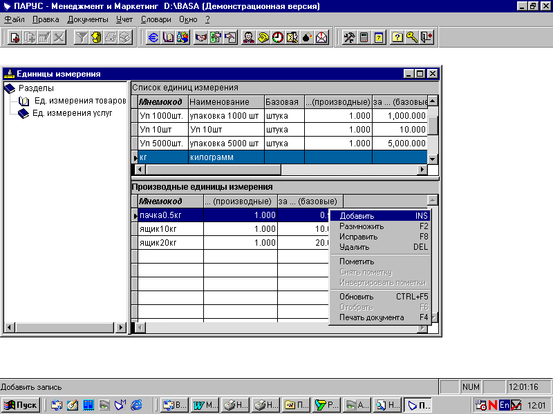 ткройте раздел Словари Единицы измерения. Создайте в панели каталогов раздел Единицы измерения товаров: в панели каталога щелкните правой кнопкой мыши на разделе (каталоге), для которого нужно создать подраздел (подкаталог) и выберите из контекстного меню команду Добавить. Появится новый раздел, который Вы сможете переименовать согласно заданию. Аналогичным способом создаются подразделы.