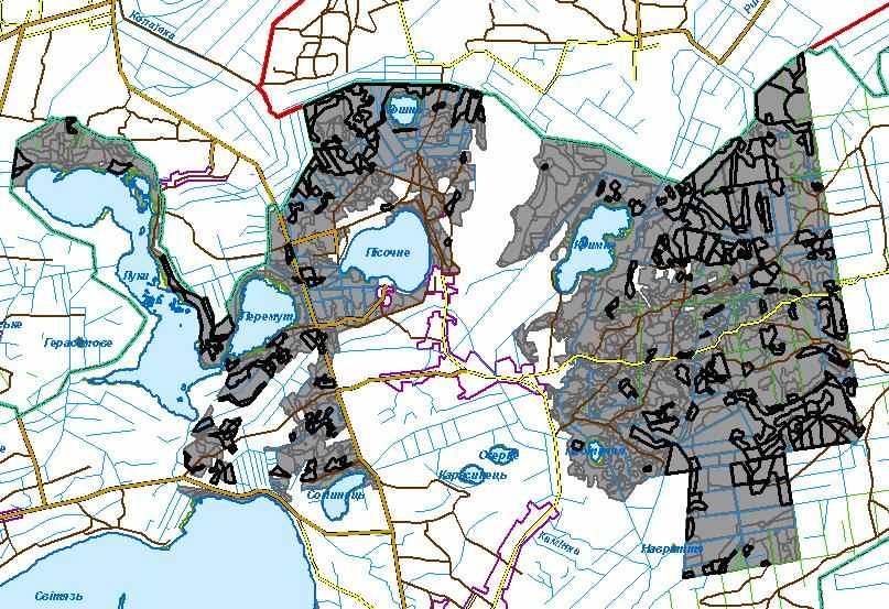 Границі Шацького НПП були нанесені шляхом векторизації їх зображень на туристичній карті М 1:50000 та суміщення з природними об’єктами і контурами (меліоративними каналами, лісовими просіками, дорогами різних класів, контурами лісу). Державний кордон визначався на топографічній карті М 1:100000 та суміщенням з природними об’єктами (р. Західний Буг, меліоративні канали, лісові просіки).