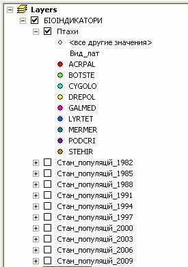 Латентні екологічні загрози задовго до появи явних ознак можуть бути виявлені біоіндикаторами. Тому вивчення їх поведінки важливе для передбачення розвитку екосистем. У ГІС біоіндикатори виділені в окрему групу (рис. 4). У шарах цієї групи відображається локалізація та чисельність популяції певного виду (на даний час це 9 видів птахів). Передбачена можливість відображення динаміки зміни та трансформації цих популяцій.