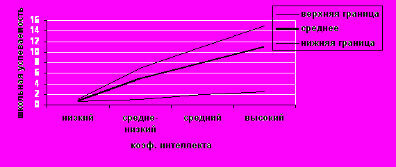 Рисунок 10. Зависимость школьной успеваемости от коэффициента интеллекта (принципиальная схема) Виден значительный разброс данных – низкий коэффициента интеллекта определяет низкую успеваемость, но чем IQ больше, тем эта зависимость слабее.