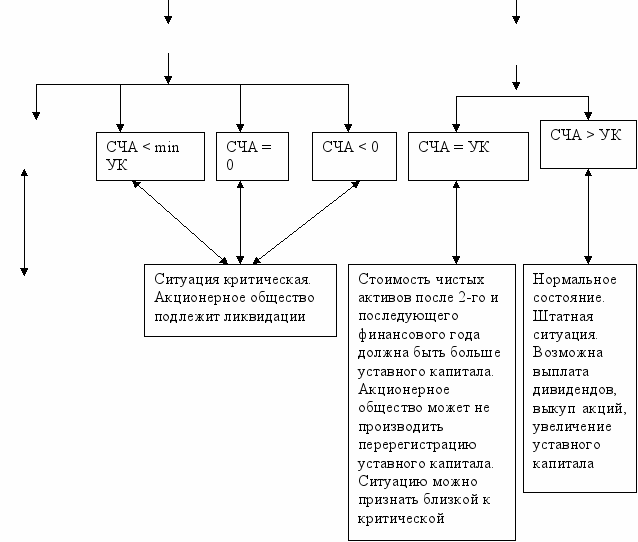 В диссертационном исследовании не только доказана необходимость по-новому, т.е. с помощью новых критериев и подходов, оценивать соотношение «стоимость чистых активов – уставный капитал», но, и раскрыто содержание этих подходов. В соответствии с положениями Гражданского кодекса РФ и ФЗ «Об акционерных обществах», когда речь идет о соотношении чистых активов и уставного капитала, то оценка управленческой ситуации базируется на принципе: больше или меньше. При этом: если стоимость чистых активов, хотя бы на одну единицу измерения (например, на один рубль) больше уставного капитала, то ситуация идентифицируется как нормальная (штатная). Алгоритм аналитического обоснования управленческого решения по результатам оценки соотношения «чистые активы – уставный капитал» в соответствии с нормами ГК РФ и ФЗ «Об акционерных обществах» представлен на рисунке 2.