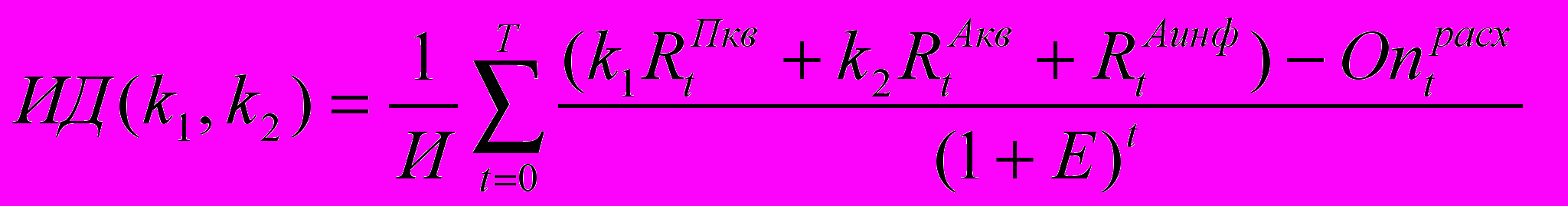 | Чистый дисконтирован-ный доход | k 1 + k2 = 1k1 > 0, k2 > 0 | Показатели оценки эффективности инвестиций в строительство и реконструкцию МЖК (ЧДД>0, ИД>1) рассматриваются с точки зрения собственника, который заинтересован в последующей эксплуатации, и с позиции инвестора, рассчитывающего на доходы от продажи помещений или сдачи в аренду |