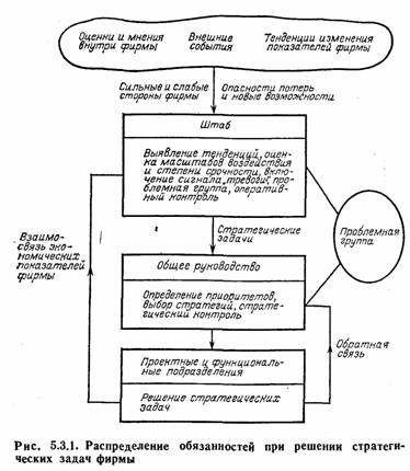 Слово «штаб» заключено в кавычки, поскольку эта группа, занятая изучением динамики внешней среды, интерпретацией полученных данных и их оценкой, осуществляет свои функции в различных условиях по-разному. На крупном предприятии анализ стратегических задач поручают специальному «штабному» отделу, который может быть частью более крупного планового отдела. В небольшой же фирме два-три высших руководителя периодически выполняют роль «штабников» с целью систематизации стратегических задач, частично привлекая к этой работе одного или нескольких помощников.