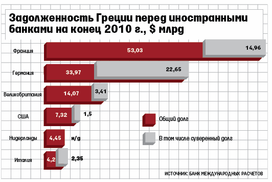 В 2010 г. Греция получила от ЕС и МВФ 110 млрд евро помощи. До 15 июля она должна рефинансировать долги на сумму 12 млрд евро.