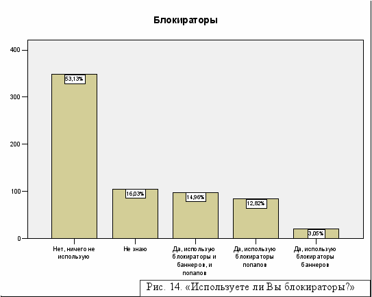 оследний закрытый вопрос в Анкете был об использовании посетителями блокираторов рекламы.Большая часть респондентов не использует никакие виды блокираторов: ни блокираторы баннеров, ни блокираторы всплывающих окон (попапов). Тех, кто не знает, что это такое, тоже можно отнести к этой группе. В итоге получится, что 69% посетителей портала не использует подобные программы. Суммируя группу тех, кто использует блокираторы попапов с той, в которой используют и блокираторы попапов, и блокираторы баннеров, получим тоже достаточно большую группу, в 27% от числа всех посетителей, из тех, кто всплывающие окна не увидят. Это говорит о том, что наиболее эффективные методы размещения рекламы на портале – в виде баннеров и в виде текстовых сообщений (они-то уж точно никогда ни одной программой не будут заблокированы).