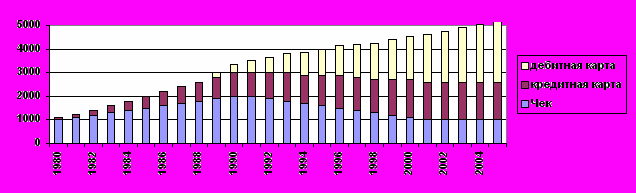 Первая, это естественно наличные деньги. Второе, это чики. Чековый платежный инструмент, это конечно англо саксонская модель, но даже там роль чеков роль чеков в денежном обращении сокращается. Посмотрим диаграмму. Мы сейчас говорим про ритейловый бизнес, а не про межбанковские расчеты. Мы говорим только про розничный банковский бизнес, т.е. это работа непосредственно с клиентами. Причем обычно с клиентами мелкими, большей частью даже физическими лицами.