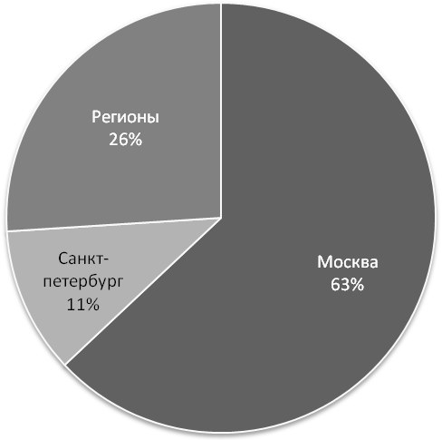 Интересна ситуация по количеству агентств, работающих на рынке. Исследования выявили, что в России в 2004 году работало около 760 агентств. При этом практически равные доли приходились на Москву – 31%, что составляло 240 агентств, города-миллионники – 26%, или 200 агентств, и другие регионы России – 32%, или 240 компаний. В Санкт-Петербурге работало 80 агентств, или 11% от общего числа (рис. 2).