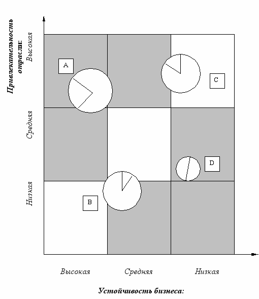 Кружки обозначают СЭБ компании; размеры кругов пропорциональны доле отраслей, в которых данные СЭБ являются конкурентоспособными. Сегменты внутри кружков обозначают долю рынка каждого СЭБ. Рекомендуется также отображать в матрице планируемые положения СЭБ. Причем, делать это следует как при неизменной стратегии, так и в случае ее изменения. При сравнении реальной и планируемой матриц руководство сможет своевременно выявить будущие проблемы или возможности, Анализ бизнес-портфеля компании также должен предотвратить вкладывание денег в рынки, которые кажутся привлекательными, однако на самом деле не имеют устойчивости.