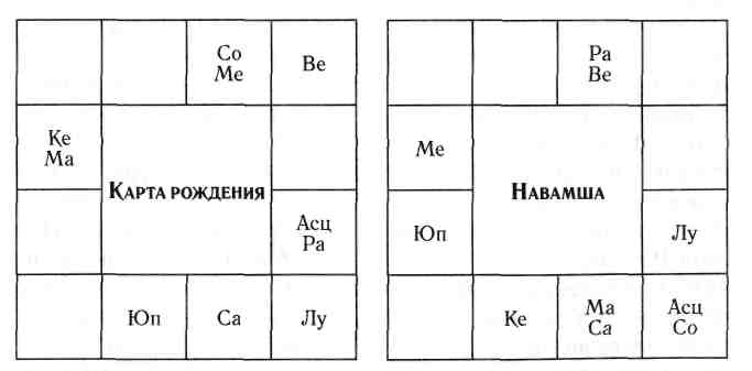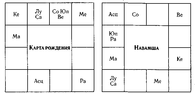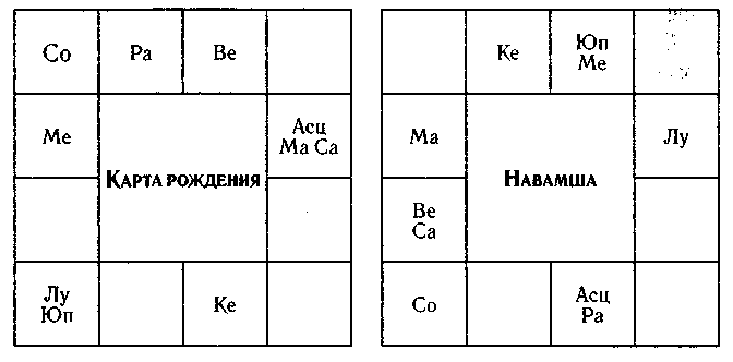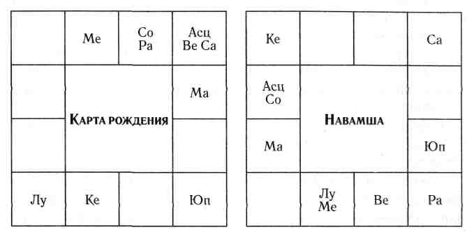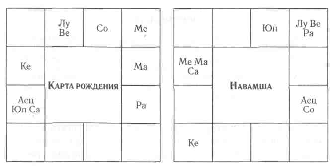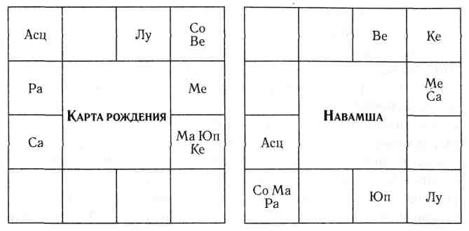 Венера, капха-планета, восходит в Близнецах, в экспрессивном воздушном знаке, чуть дальше от асцендента. Но ее влияние становится умереннее из-за Сатурна, тоже расположенного в Близнецах. Сатурн по градусам находится в близкой оппозиции экспансивной Луне в Стрельце, отмечая своим влиянием восходящий и лунный знаки, а соответственно и физиологию с психикой. Сатурн варготтама — он в одном и том же знаке в раши и навамше, а также управляет асцендентом навамши (Водолей).