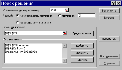 Нам осталось запустить поиск решения и ввести адреса ячеек и ограничения, как на рисунке ниже: