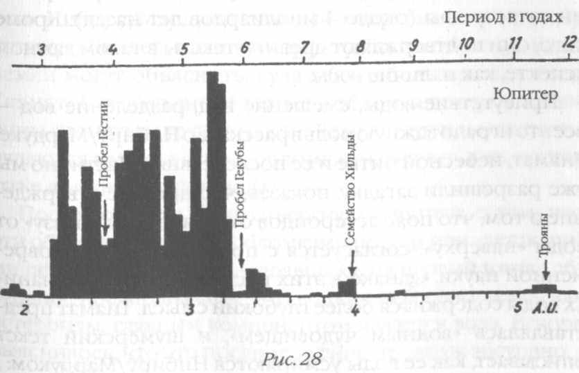 Помимо промежутков между группами астероидов, астрономы обнаружили пустые участки между семействами астероидов (рис. 28). Новейшие теории утверждают, что в этих промежутках когда-то существовали астероиды, но они были выброшены в дальний космос (за исключением захваченных гравитационным полем внешних планет); кроме того, эти астероиды, вполне вероятно, были разрушены в результате «катастрофических столкновений» («McGraw-Нill Encyclopedia of Astronomy», 1983). В отсутствие убедительных объяснений причины таких выбросов и катастрофических столкновений единственной правдоподобной теорией остается та, что предложена в древних шумерских текстах: эллиптическая орбита Нибиру/Мардука периодически (по моим подсчетам каждые 3600 земных лет) приводит его в пояс астероидов. Как показано на рисунках 9 и 10, из древних текстов можно сделать вывод, что Нибиру/Мардук прошел мимо Тиамат с ее внешней стороны (то есть со стороны Юпитера) и что его повторяющиеся возвращения в эту зону являются причиной существующего там «пробела». Именно периодическое возвращение Нибиру/Мардука приводит к «выбросу» и «уничтожению» астероидов.