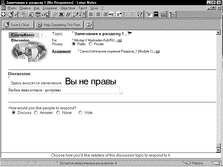 CourseRoom (Аудитория) – интерактивно организованная с помощью электронной коммуникации группа. Это место, где студенты участвуют во взаимных дискуссиях по обсуждению пройденного материала, где можно создать виртуальную команду для того, чтобы поработать совместно над заданиями (assignments), предлагаемыми преподавателем. Студенты инициируют эти дискуссии, комментируют их и делают соответствующие выводы. Аудитория интерактивно связана с базами данных MediaCenter (Медиа Центр) и Расписанием.