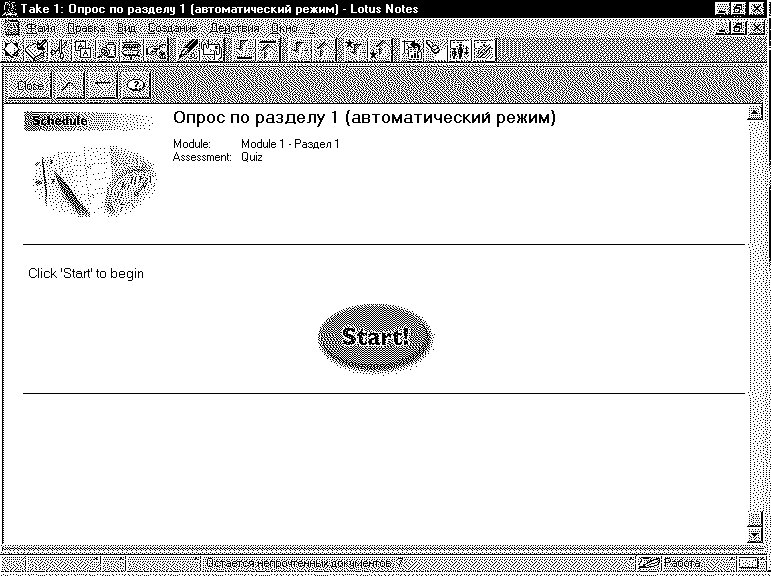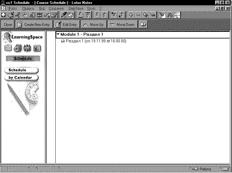 Schedule (Расписание) – выдаваемая обучаемому дорожная карта курса. Она показывает Вам, где предстоит тот или иной вид учебной деятельности (индивидуальной или групповой), назначенной преподавателем. Студент работает с Расписанием на протяжении всего курса, открывая находящиеся здесь документы последовательно и, делая то, что они предписывают делать. Персональное обеспечение учебного процесса достигается рассылкой студентам, изучающим данный курс расписаний время сессий, а также заданий, вопросников и дат, когда они проводятся. Расписание интерактивно связано с базами данных MediaCenter (Медиа Центр) и CourseRoom (Аудитория).