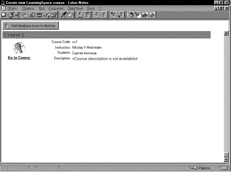 Нажатие кнопки "ОК" позволяет создать курс со всеми необходимыми базами. Его название Course 1 появится в списке курсов базы LearningSpace Central. Новая форма будет иметь вид: