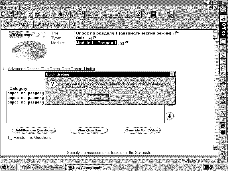 Для проверки знаний студентов существуют возможности, предоставляемые преподавателю базой Assessment Manager (Менеджер оценки). После того, как учебный модуль введен в Медиа Центр, преподаватель может обратиться к Менеджеру оценки, нажав левой клавишей мыши на значок
