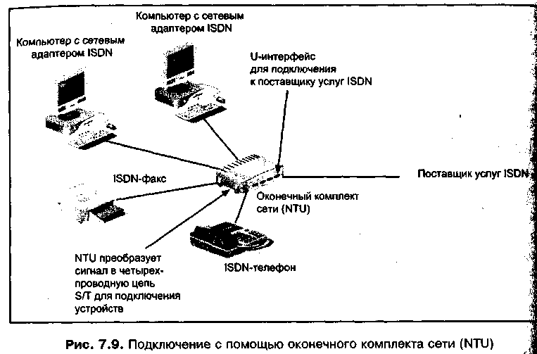 В-третьих, ISDN-линию можно подключить к сетевому устройству, называемому оконечным комплектом сети (network termination unit, NTU). NTU имеет U-интерфейс, подключаемый к ISDN-линии через коннектор RJ-45. С помощью S/T-интерфейсов, имеющихся в NTU, можно подключить несколько устройств (до восьми), в том числе компьютеры, факсы и телефоны. На рис. 7.9 показано, как к сети ISDN подключаются компьютеры с ISDN-совместимыми сетевыми адаптерами, факсимильные аппараты и телефоны, разработанные для связи с ISDN.