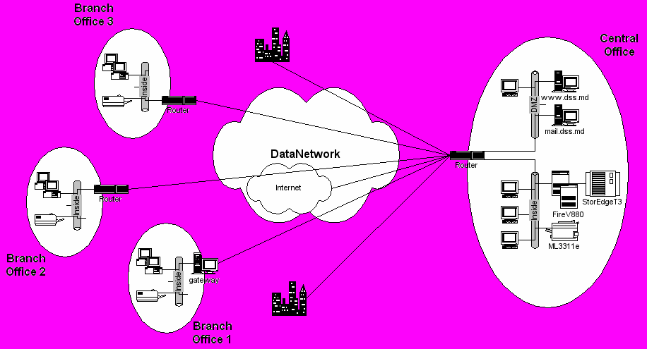 Доступ к сетевым ресурсам и информации, хранящимся в других организация, может быть осуществлен двумя способами – через сеть передачи данных, если организация уже имеет соединение с этой сетью, либо непосредственно из центрального офиса ДССИ с использованием коммутируемых или выделенных линий. Имеющийся в распоряжении ДССИ маршрутизатор Cisco 2511 имеет все необходимое аппаратное обеспечение для осуществления обоих видов соединения.