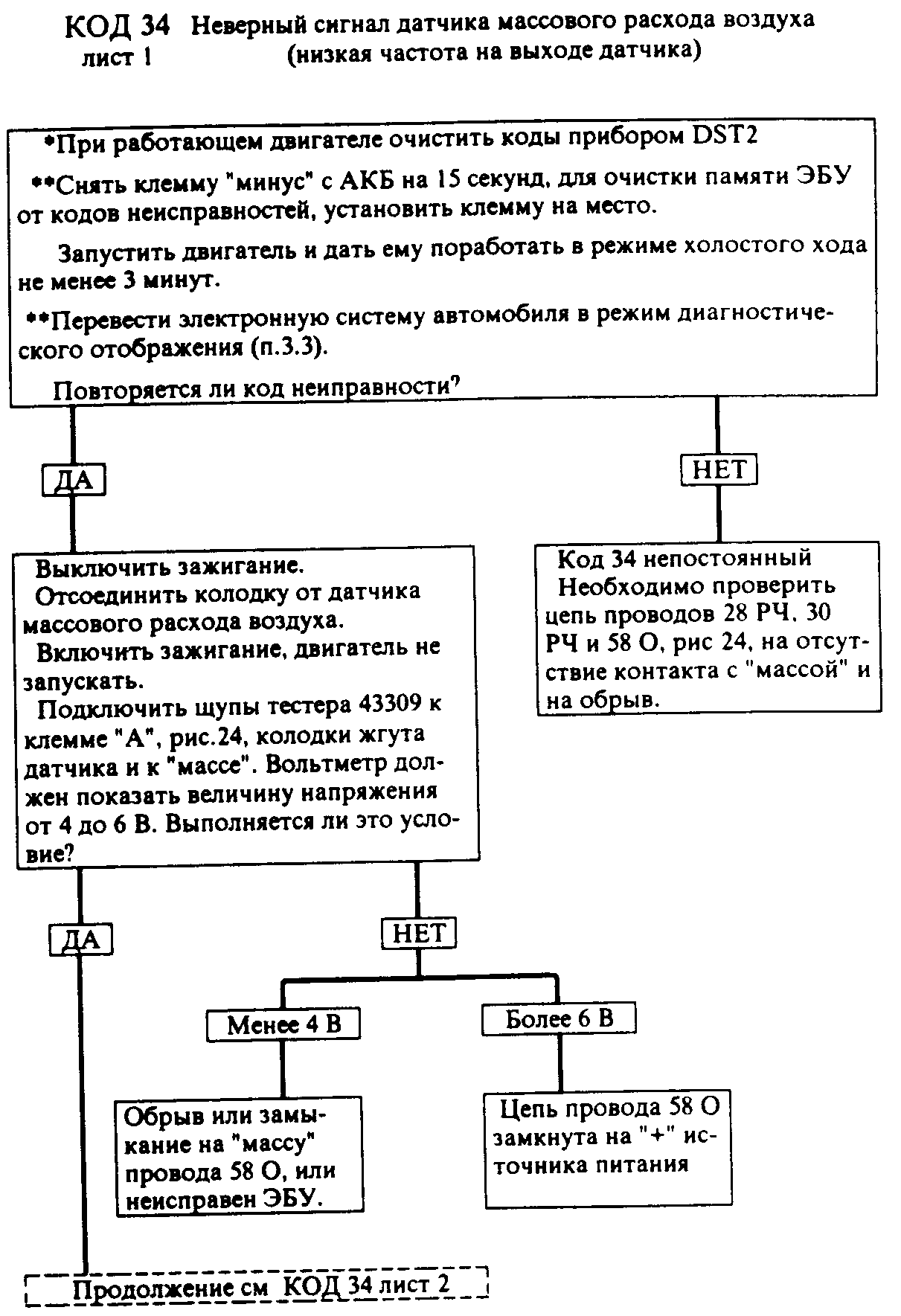 | 34 | Неверный сигнал датчика массового расхода воздуха (низкая частота на выходе датчика) |
