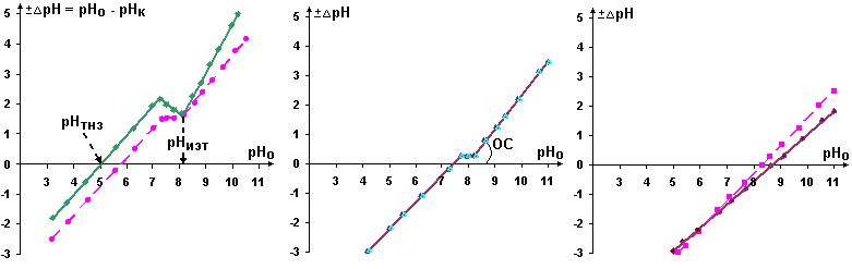 Условием определения рНтнз является строгое выполнение равенства (ГН+ = ГОН−). Для этого в широком интервале значений начальной кислотности электролита подбирают такое значение рН0, при котором избирательное поглощения из раствора ионов Н+ и ОН− равно нулю (±∆рН=0). Экспериментально определено, что для α-Al2O3, γ-Al2O3 и δ-Al2O3 значения ±∆рН=0 достигаются при рН=8.7, 7.4 и 5.0 соответственно (рис. 3).