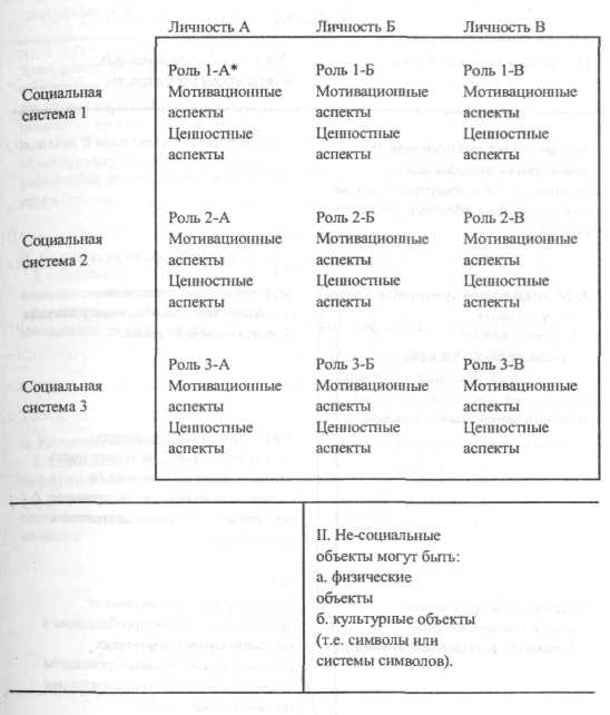 Объектом ориентации «эго» является не его мотивация и не интернализованные им культурные эталоны. Мы уже отмечали, что для аналитических целей интернализованные ценностные эталоны рассматриваются как независимая категория системы действия, а не как часть объектного мира.