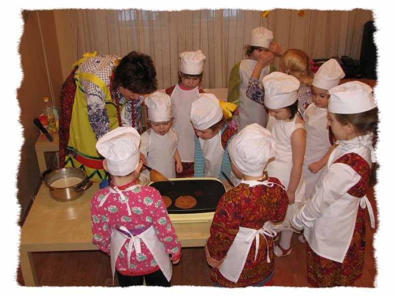 ля создания необычной праздничной атмосферы – начинаем с самих себя: наряжаемся вместе с детьми в русские народные костюмы – яркие платки, рубахи, сарафаны… Рисуем яркие щёки и веснушки аква-гримом :)ВЫПЕКАЕМ БЛИНЫ