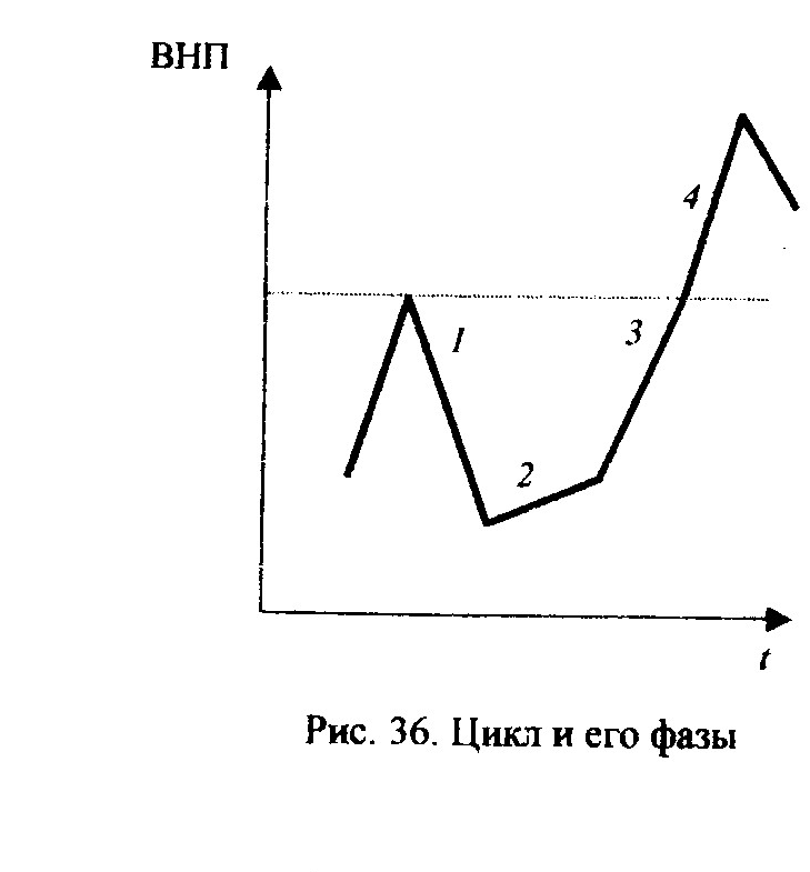 К. Маркс первым выделил четыре фазы экономического цикла, сменяющие друг друга: кризис (спад) 1, депрессию 2, оживление 3 и подъем (пик) 4 (рис. 36). Многие экономисты сохраняют четырехфазное деление экономического цикла, хотя названия фаз и их виды могут несколько различаться. Существуют и другие классификации цикла. Так, некоторые экономисты выделяют только две фазы – рецессию (спад) и подъем. Каждая фаза характеризуется своей конъюнктурой.