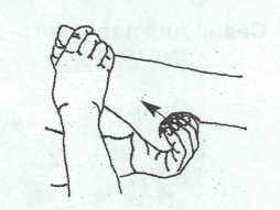 «Гусеничка». Этот приём представляет собой растирание спины и нижнего участка шеи (от поясницы вверх) подушечками обоих больших пальцев, расположенных параллельно, по линиям, отстоящим от позвоночника на 1 – 1,5 см; другие пальцы, «Переступая» как ножки гусеницы, направляют движение (рис.8). Выполнять 10 – 12 раз, с достаточным давлением пальцами, до появления пунцовых полос на коже.