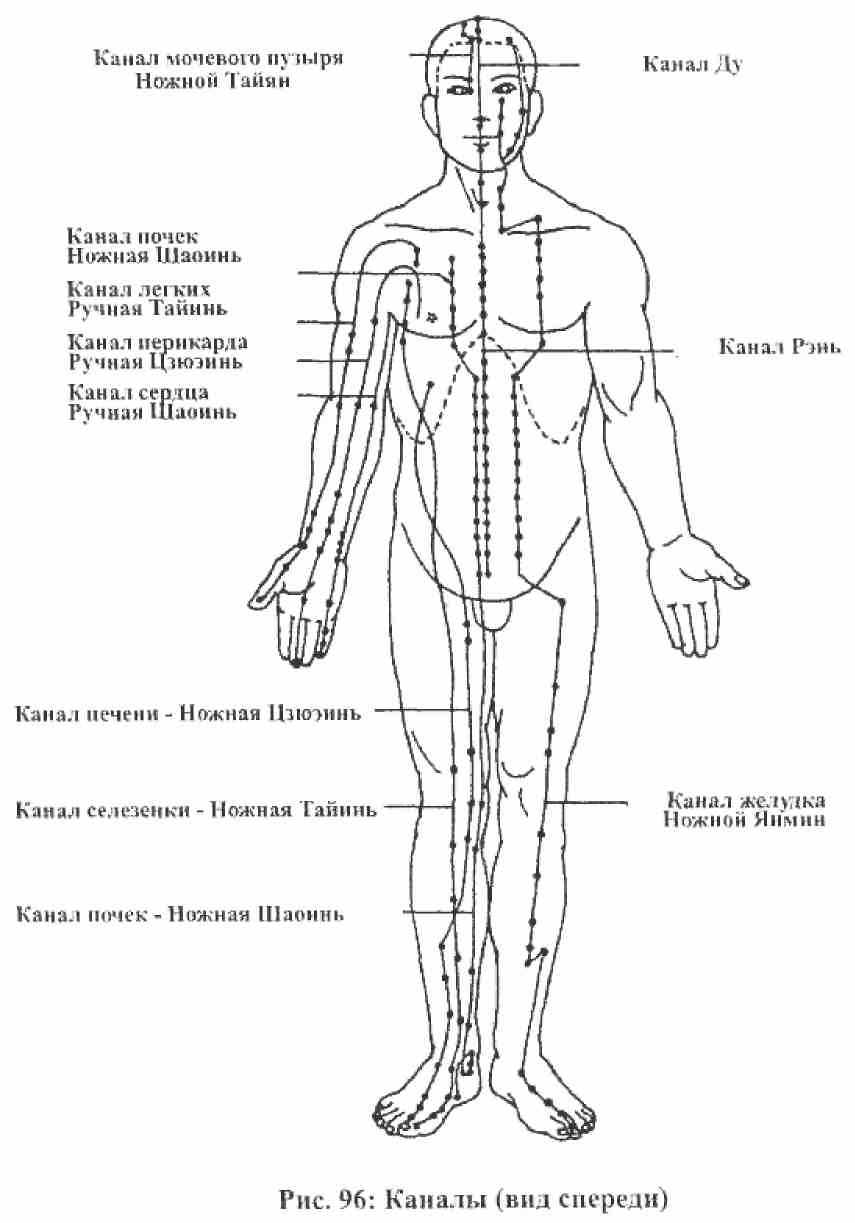 лицо и позвоночник. Три канала, которые проходят по внешним сторонам верхних конечностей, являются Янканалами руки, а три канала, проходящие по внешним сторонам нижних конечностей, являются Янканалами ноги. Что же касается распределения двенадцати главных каналов в голове, туловище и четырех конечностях, то Янмин трех янских каналов ноги и руки находится спереди, Шаоян в середине, а Тайян сзади; при этом Тайинь трех иньских каналов руки и ноги находится спереди, Цзюэинь в середине, а Шаоинъ сзади.