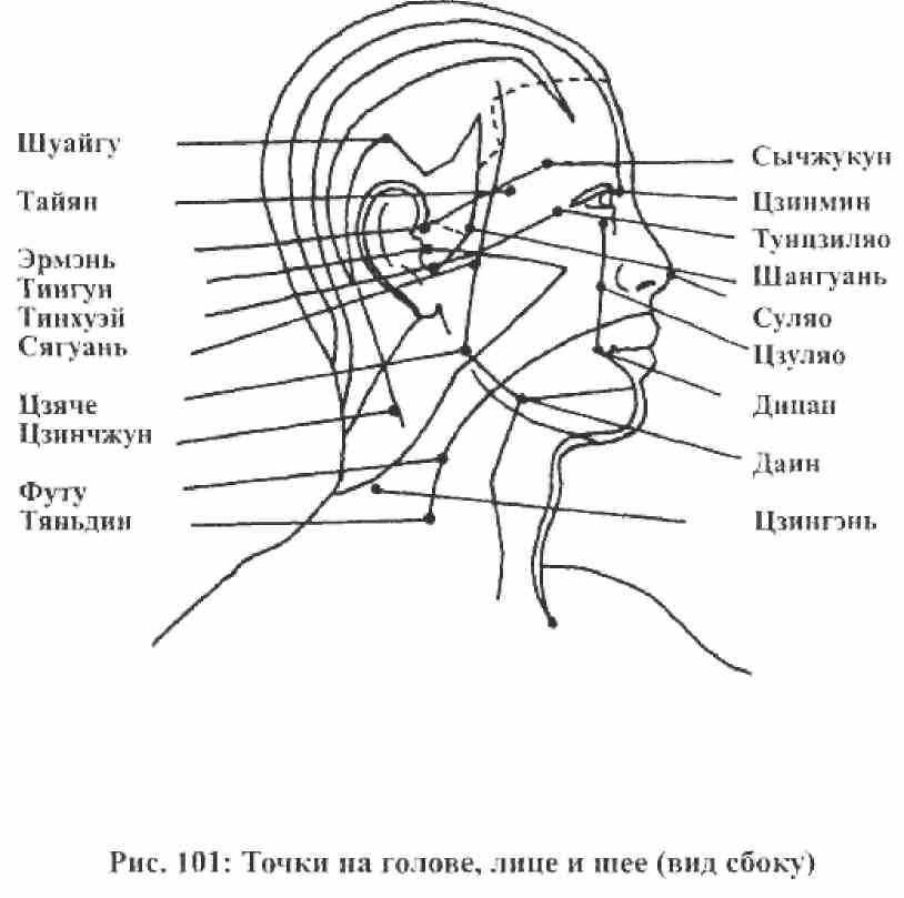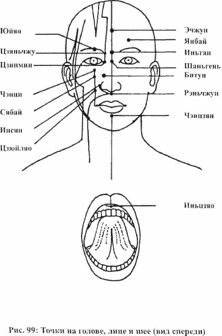 (д) Тоувэи и Фэнчи Прижмите средние пальцы к точке Тоувэи и сделайте девять поворотов внутрь, потом девять поворотов наружу. Затем выполните упражнение Трехкратного Дыхания на точке. После этого прижмите средние пальцы к точке Фэнфу и сделайте девять поворотов внутрь и девять наружу, а затем выполните еще раз упражнение Трехкратного Дыхания на точке. Потом опустите руки к Даныпянъ, скользя по передним частям щек (Рис. 115-1, 2).