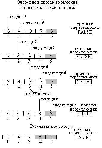 - перед началом перебора элементов признаку перестановки присваивается значение "перестановки пока нет"