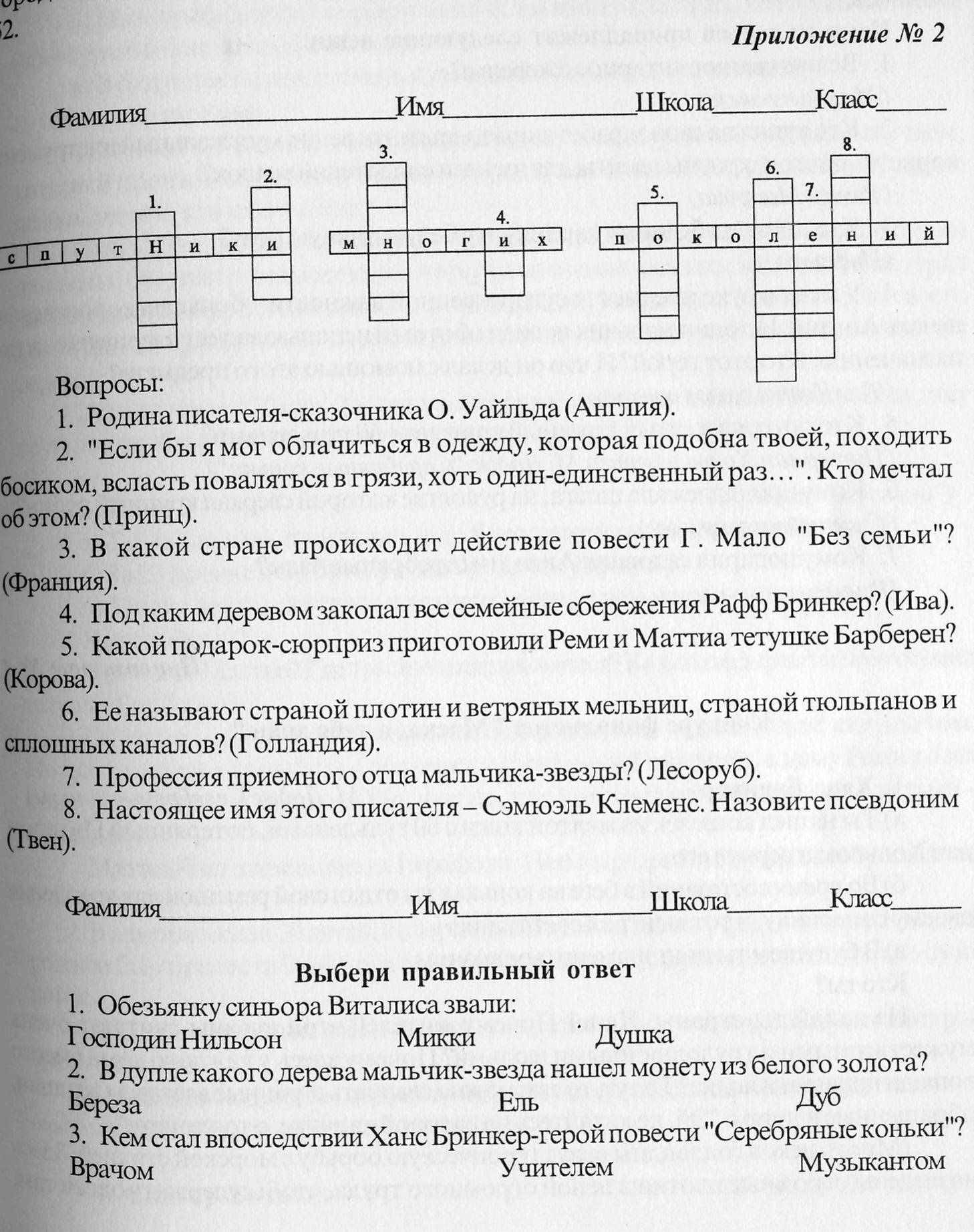 Во время короткого вступления следует подчеркнуть, что сказки О. Уайльда, книги М. Твена, повесть Г. Мало "Без семьи", М. Додж "Серебряные коньки" на протяжении более 100 лет радуют все новые и новые поколения читателей. Ведь ребята познакомились с книгами, которые с таким же удовольствием читали в свое время их родители, бабушки и дедушки. Потом следует обратить внимание ребят на выставку творческих работ по этой теме.