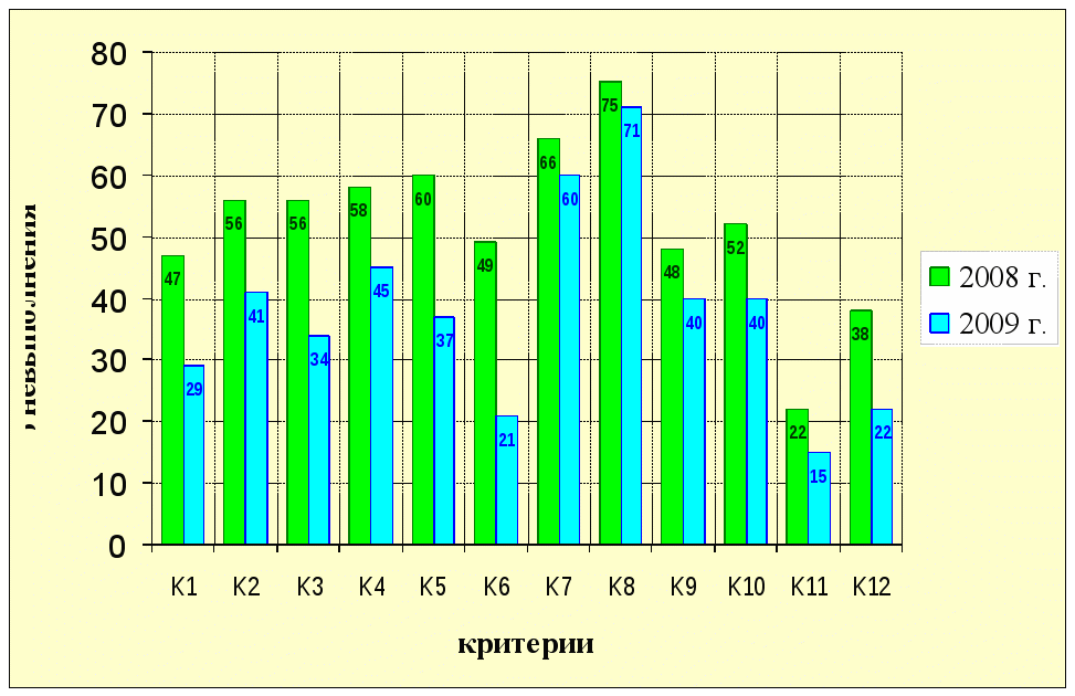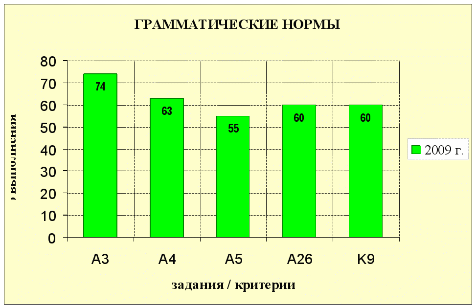 Наметилось снижение результата по критерию А5 по сравнению с 2008 годом: 2009 год – 55%, в 2008 году – 77,7% . Большинство экзаменуемых не способны отличить среди четырёх предложений правильно построенную синтаксическую конструкцию от синтаксической конструкции, построенной с нарушением грамматической нормы.
