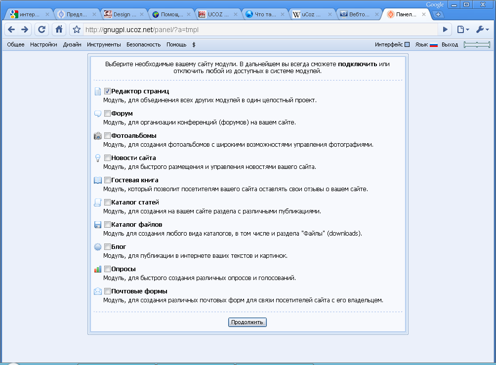 Потом нам предлагают выбрать, необходимы для нашего сайта модули, которые в дальнейшем мы сможем подключать или отключать (рис. 1.9). Я выбрала только «Редактор страниц».