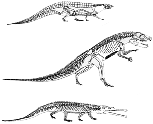 РИСУНОК 46. Триасовые текодонты – экологические аналоги более поздних архозавров (динозавров и крокодилов): (а) – этозавр Staganolepis (аналог анкилозавров), (б) – псевдозух Ornithosuchus (аналог теропод-карнозавров), (в) – фитозавр Parasuchus (аналог крокодилов).