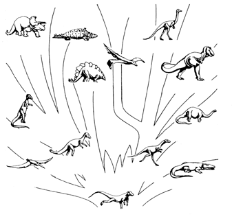 Эволюция архозавров выглядит так (рисунок 44). От пермо-триасовых текодонтов обособились к концу триаса все остальные отряды: крокодилы, птерозавры и два отряда динозавров – ящеротазовые (Saurischia) и птицетазовые (Ornitischia). К ящеротазовым относятся такие на первый взгляд несхожие друг с другом формы как хищные двуногие тероподы (размером от тиранозавра – 6 м высотой, самый крупный наземный хищник всех времен – до только что описанного прекурзора, очаровательного создания величиной с ворону) и четвероногие растительноядные завроподы – самые большие наземные животные (диплодок достигал 26 м в длину при весе 30 тонн)[60]. К птицетазовым принадлежат исключительно растительноядные формы, по большей части крупные и очень крупные: двуногие гадрозавры (утконосые динозавры) и игуанодоны, и вторично-четвероногие анкилозавры (панцирные динозавры), стегозавры и цератопсиды (рогатые динозавры) (рисунок 45).