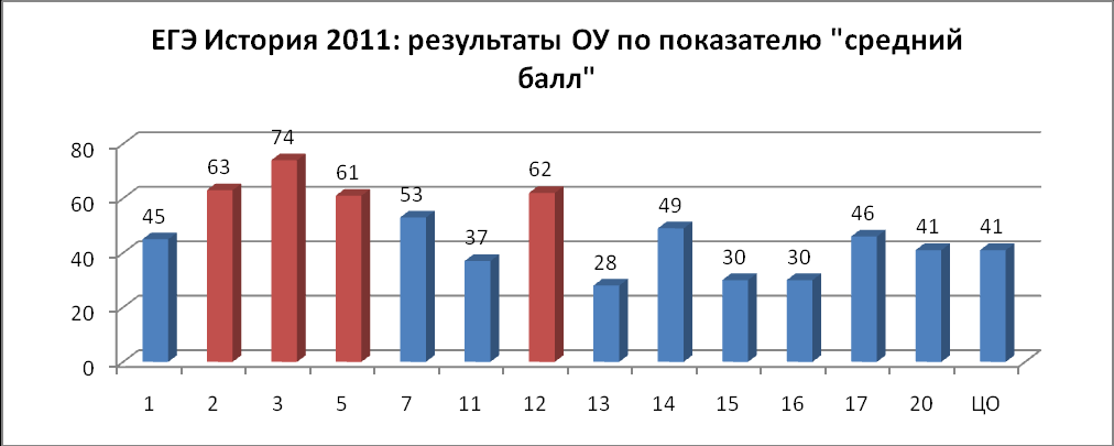 Средний балл по городу – 54,9. Число сдававших – 55 (8,9% ), в т.ч. по ОУ: