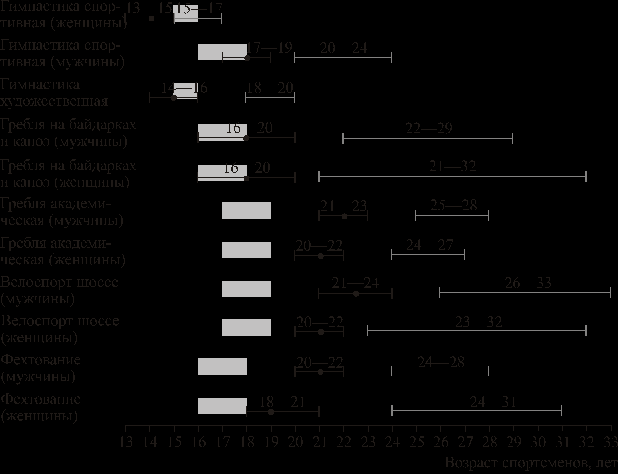 — зона первых успехов; — зона наивысших результатов.Кроме гимнастики, демонстрация первых серьезных спортивных результатов приходится на возраст 18―24 года, который не попадает в возрастную зону Юношеских Олимпийских игр. Это, в свою очередь, может привести к тому, что тренеры, форсируя подготовку юных спортсменов к этим соревнованиям, ставят под сомнение успешность и длительную карьеру спортсмена на этапе максимальной реализации индивидуальных возможностей. Правильный отбор и ориентация подготовки позволит тренеру рационально построить тренировочный процесс, и обеспечить эффективное выступление на соревнованиях с учетом индивидуальных особенностей спортсмена. Основной задачей отбора и ориентации на этом уровне является оценка перспектив достижения спортсменами высокого мастерства в конкретных дисциплинах и видах соревнований, а критериями — устойчивая мотивация к достижению высокого мастерства, отсутствие отклонений в состоянии здоровья, которые могли воспрепятствовать успешному спортивному совершенствованию, психологическая и функциональная готовность к большим нагрузкам, резервы дальнейшей адаптации функциональных систем и механизмов, прироста двигательных качеств, совершенствования важнейших элементов техники, тактической и психологической подготовленности. Была разработана комплексная система отбора, которая принципиально отличается от программ отбора, используемых ранее, а именно разработкой дифференцированных шкал для спортсменов разного пола, возраста и вида спорта, периода подготовки в годичном цикле. Такая система позволяет оценить состояние отдельных компонентов двигательной функции и двигательный потенциал спортсмена в целом, предусматривает ориентацию тренировочного процесса на последующих этапах подготовки. Результаты в тестах, представленные в интегральных оценках, выражаемых в баллах, характеризуют потенциальные возможности спортсменов, прошедших предварительную подготовку и имеющих определенную спортивную квалификацию. Это дает возможность выявить из этой категории тех спортсменов, кто способен в ближайшие годы войти в состав национальных сборных команд и демонстрировать результаты международного уровня. Система тестов включает четыре блока показателей ― педагогический (характер предшествующей подготовки, темпы роста спортивного мастерства, уровень развития специальных физических качеств, характерные для вида спорта), морфологический, физиологический и психофизиологический, по каждому из которых рассчитывается интегральная оценка. По результатам проведенных исследований, с учетом пола, возраста и вида спорта, разработаны шкалы, позволяющие перевести зарегистрированные у каждого спортсмена показатели в общую систему баллов. Такой подход дает возможность выявить преимущества и недостатки спортсмена в отдельных регистрируемых показателях, и рассчитать оценки в баллах по каждому из блоков показателей отдельно, а затем ― рассчитать общую оценку ― индекс перспективности (рис. 9). Верификация предложенной системы отбора и ориентации подготовки спортсменов проводилась путем систематического многолетнего наблюдения за стабильным контингентом спортсменов (экспериментальные исследования проводились в группе спортсменов по гребле на байдарках и каноэ