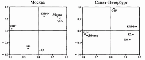 Рис. 8. Факторный анализ голосования избирателей Москвы и Санкт-Петербурга на парламентских выборах 1999 г.