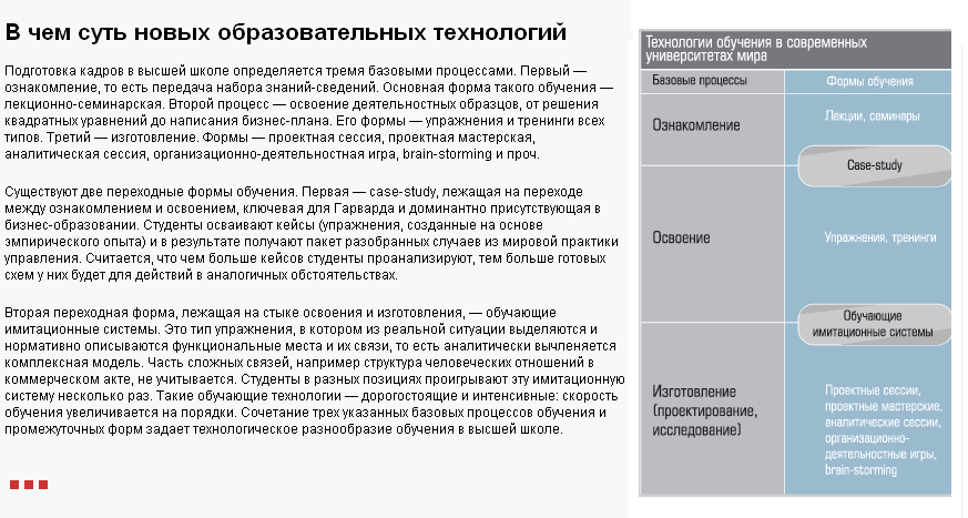 В мире же начиная с 70-х годов доля учебных заведений, эксплуатирующих эту систему, неуклонно снижается. Сегодня на "контактную педагогику" приходится лишь 15-20% всего учебного объема. Старые образовательные технологии, связанные с движением информации об уже известных фактах и сведениях, постоянно падают в цене и становятся все более доступными: Массачусетсский технологический институт перевел значительную часть своих курсов в электронную форму и открыл ее для всеобщего доступа. И оплата преподавательского труда как труда "пересказчика" становится все ниже. Продвинутые же университеты мира от повествовательных способов обучения перешли к деятельностным.