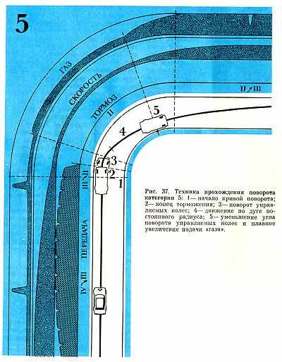 Категория 5. Крутизна поворота — от 60 до 90°, скорость прохождения 80— 60 км/ч, техника прохождения — IV передача, тормоз, III передача, тормоз, II передача (рис. 37).