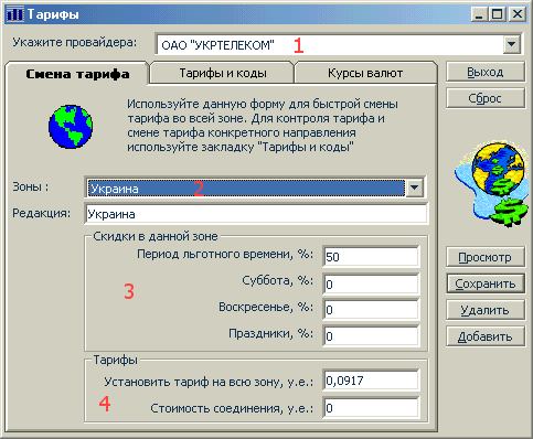 Примечание. В этой закладке устанавливается тариф и скидка на все коды выбранной зоны! Чтобы изменить тарифы и скидки для конкретного кода выбранной зоны, нужно перейти в закладку "Тарифы и коды".