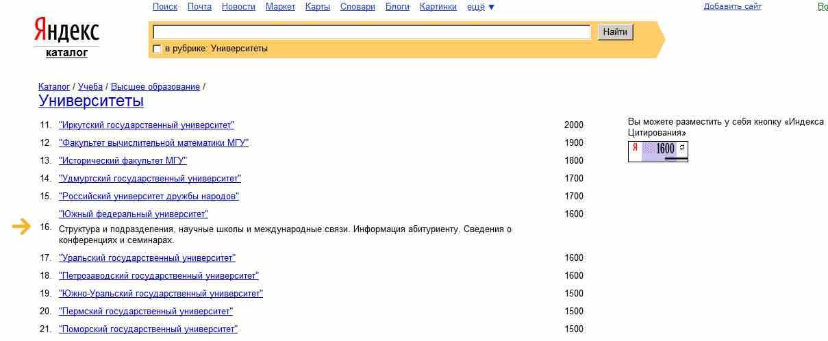 Индекс цитируемости сайта ЮФУ по данным Yandex - 1600