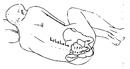 А. Положение сидя. Часто это положение является самым удобным для выполнения люмбальной пункции. Больной сидит на крае операционного стола, наклонившись вперед, ноги стоят на подставке, руки скрещены на груди. Для удобства следует попросить больного выгнуть спину дугой, подобно "раздраженной кошке". С помощью этого маневра происходит сгибание в поясничном отделе, кожа и подлежащие структуры натягиваются и межостистые промежутки становятся шире. Положение сидя не всегда можно использовать из-за боли при некоторых травмах (например, перелом шейки бедра), в родах, а также в отсутствие контакта с больным. Вместе с тем в некоторых случаях, например при выраженном ожирении, положение сидя — единственное, при котором осуществима люмбалъная пункция.
